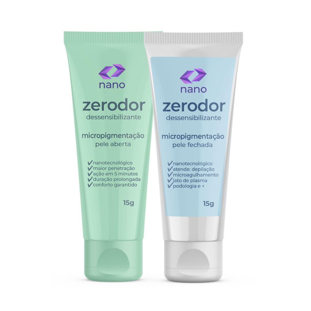O Kit Zero Dor é composto por dois dessensibilizantes nanotecnológicos de uso profissional (15 g cada): Pele Fechada, indicado para aplicação em pele intacta, e Pele Aberta, indicado para aplicação em pele já perfurada ou sensibilizada. Juntos, oferecem ação rápida, eficaz e prolongada, reduzindo a dor em procedimentos como micropigmentação, despigmentação química, microagulhamento, depilação e podologia.